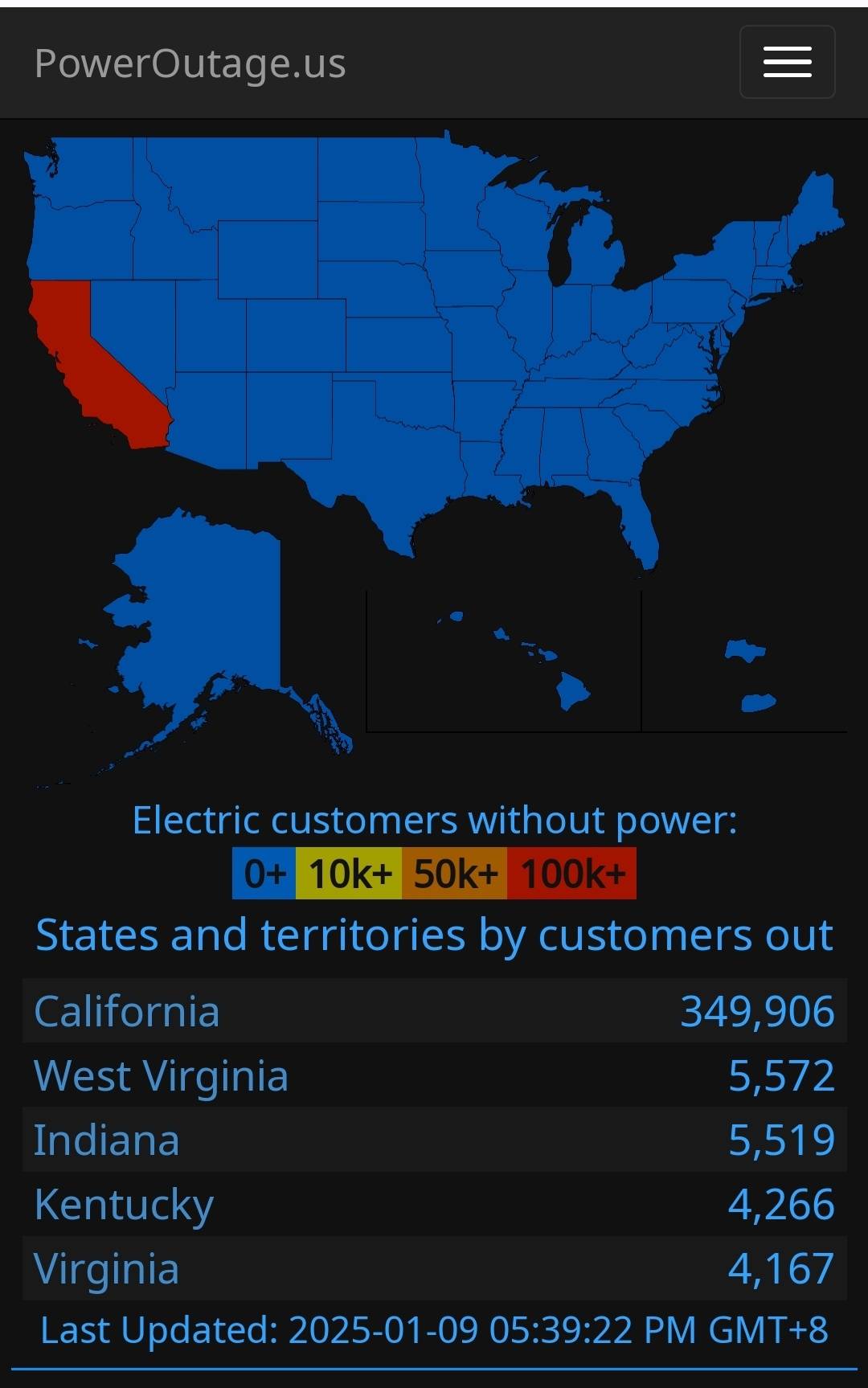 美国电力跟踪网站PowerOutage.us数据显示,截至当地时间1月9日凌晨,这场火灾已导致近150万人处于断电状态,仅加州地区就有近35万用户断电。